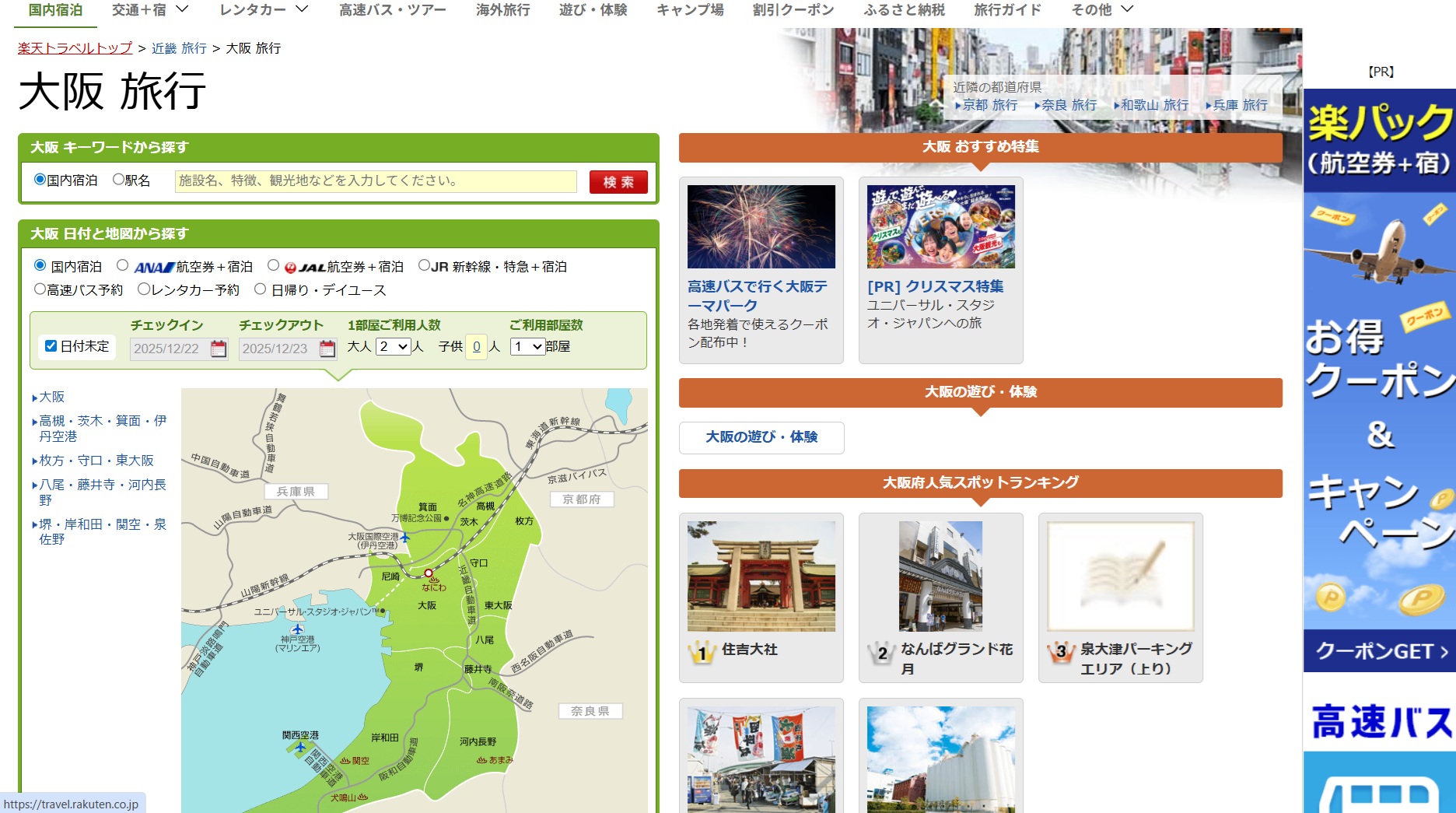 試しに目的地を大阪にして検索!