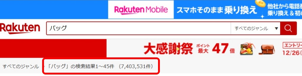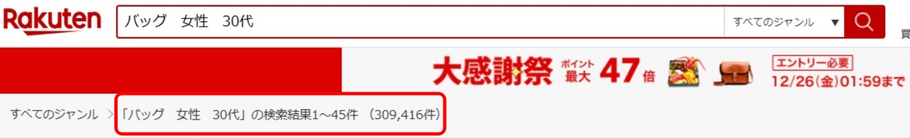 これは「バッグ」の単発キーワードで検索したからこれだけの結果が出ましたが、もちろんキーワードを増やせば